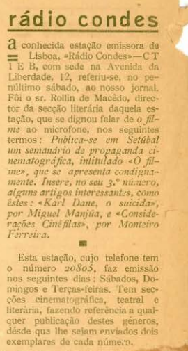 A Rádio Condes, em 1934, emitia sábados, domingos e terças-feiras. Tinha o indicativo CT1EB e ficava na avenida da Liberdade, 12, em Lisboa. De entre outras, tinha secções dedicadas ao cinema, teatro e literatura (O Filme, 3 de junho de 1934. Semanário editado em Setúbal, com Miguel Manjuá como diretor e Jacques T. da Silva como editor).