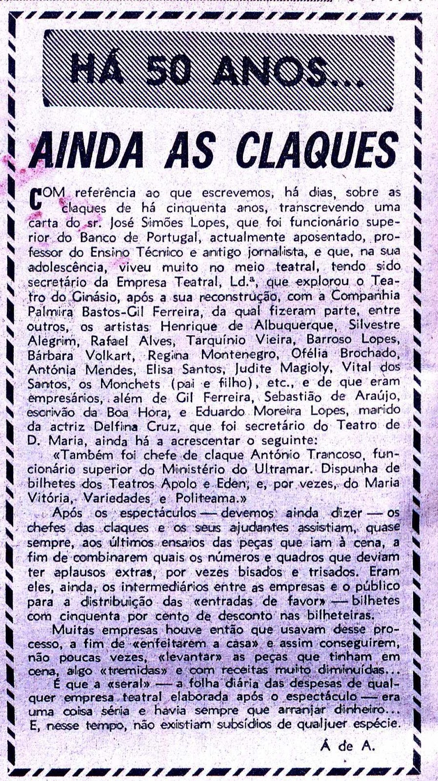 Os textos abaixo foram publicados no Diário Popular de 22 de março e de 7 de abril de 1971 e versam sobre as claques de teatro. Pormenores interessantes que remetem para um período longínquo, digamos que mais ou menos noventa anos antes. Vale a pena ler e refletir. A fabricação de emoções agradece.