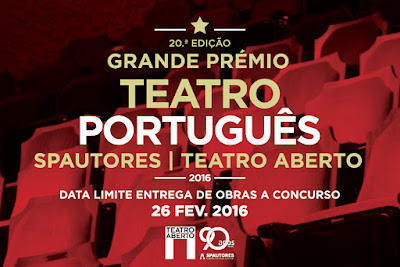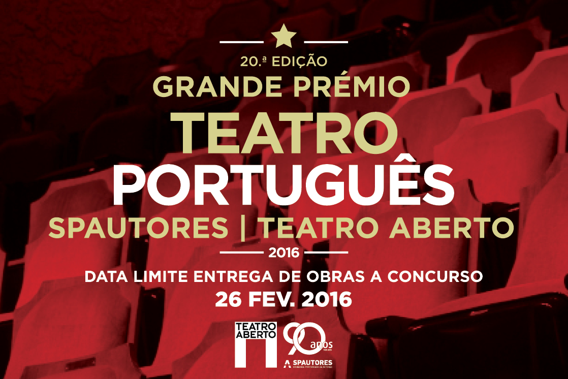 Estão abertas as candidaturas para a edição de 2016 do Grande Prémio de Teatro Português promovido pelo Teatro Aberto em parceria com a Sociedade Portuguesa de Autores. Os candidatos devem enviar as obras que desejam submeter ao concurso até 26 de fevereiro de 2016. Trata-se da 20ª edição do prémio que já levou ao palco do Teatro Aberto dez textos inéditos estreados entre 1997 e 2013. Regulamento do concurso disponível em Sociedade Portuguesa de Autores e Teatro Aberto.